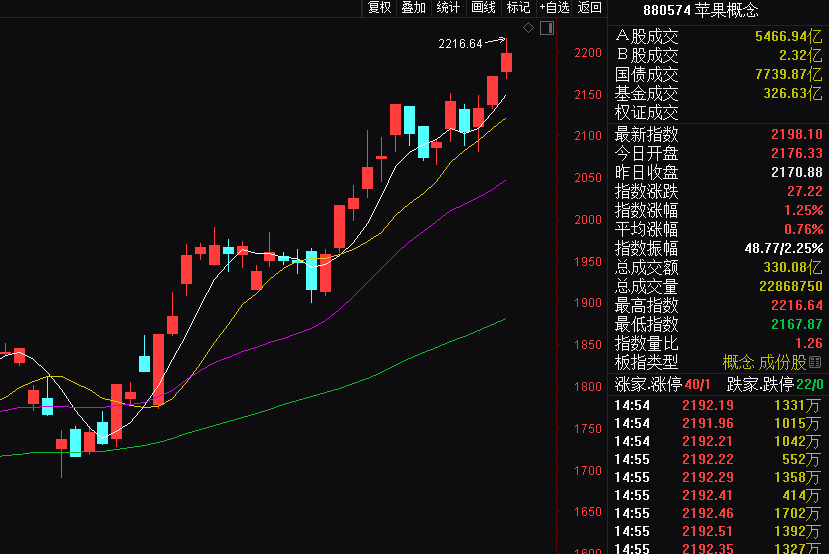 华为概念股自8月份以来就表现得十分强势,华为概念指数在一个多月时间里暴涨30%。苹果概念也同样强势,近一个月,苹果概念指数涨幅也高达25%。