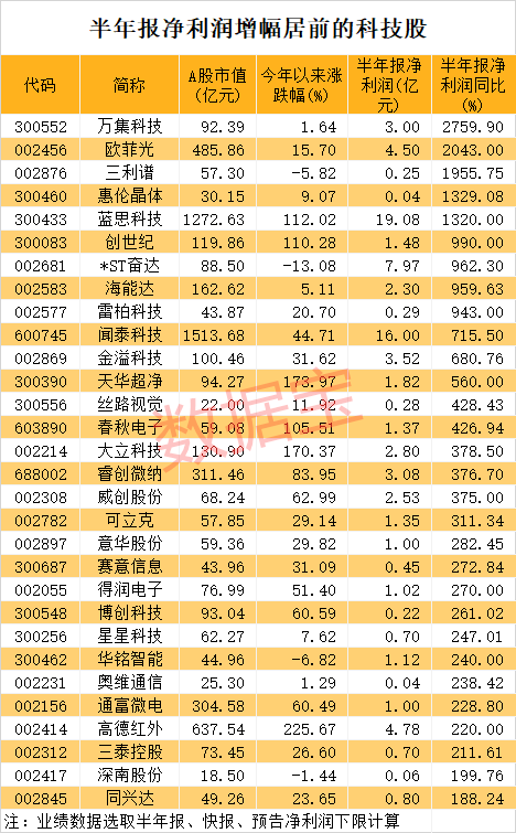 今年以来,在中芯国际登陆A股和行业景气度高涨的背景下,以芯片、消费电子、云计算为主的科技类题材股成为市场瞩目焦点,不少千亿级的科技龙头公司诞生,如用友网络、歌尔股份、三安光电、兆易创新、金山办公等。那么在过去的上半年时间里,科技公司业绩有哪些亮点?证券时报·数据宝通过梳理电子、计算机、通信等三大行业的公司业绩数据发现,按照半年报、快报、预告净利润下限计算,有53上半年净利润有望翻倍增长。