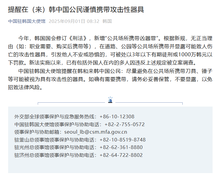 韩国新增“公共场所携带凶器罪”,我使馆紧急提醒