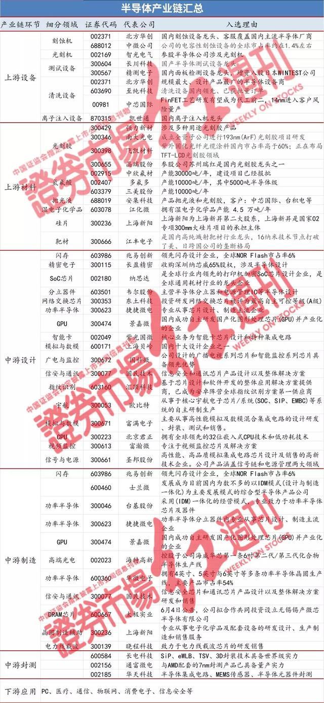 硬核科技以国产替代最为紧迫的半导体领域为代表。半导体产业链大致可以划分为上游、中游和下游。上游包括半导体材料、生产设备,代表公司有北方华创、中微公司、晶瑞股份、南大光电、强力新材、上海新阳、容大感光等;中游包括设计、制造、封测三大环节,代表公司有闻泰科技、景嘉微、汇顶科技、卓胜微、韦尔股份、兆易创新、紫光国微、长电科技等。