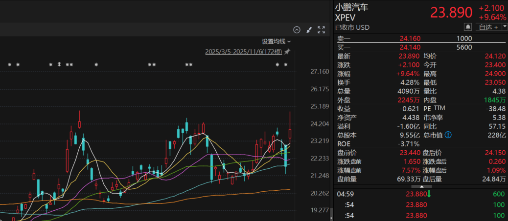 11月7日讯在何小鹏的两度自证下,资本市场给小鹏汽车投下了信任票。昨夜今晨,小鹏汽车美股开盘后大涨,盘中一度涨超14%,截至收盘涨9.64%,报23.89美元,总市值228亿美元。