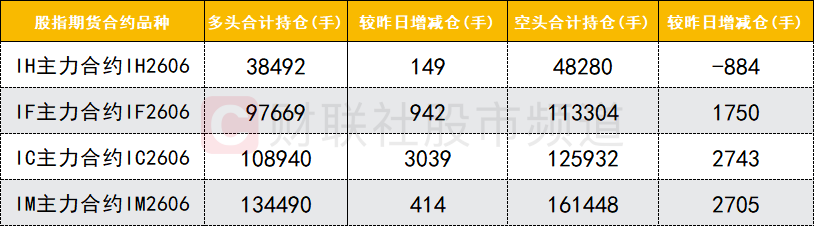 四大期指主力合约中,IF、IC、IM合约多空双方均加仓,IM合约空头加仓数量较多。