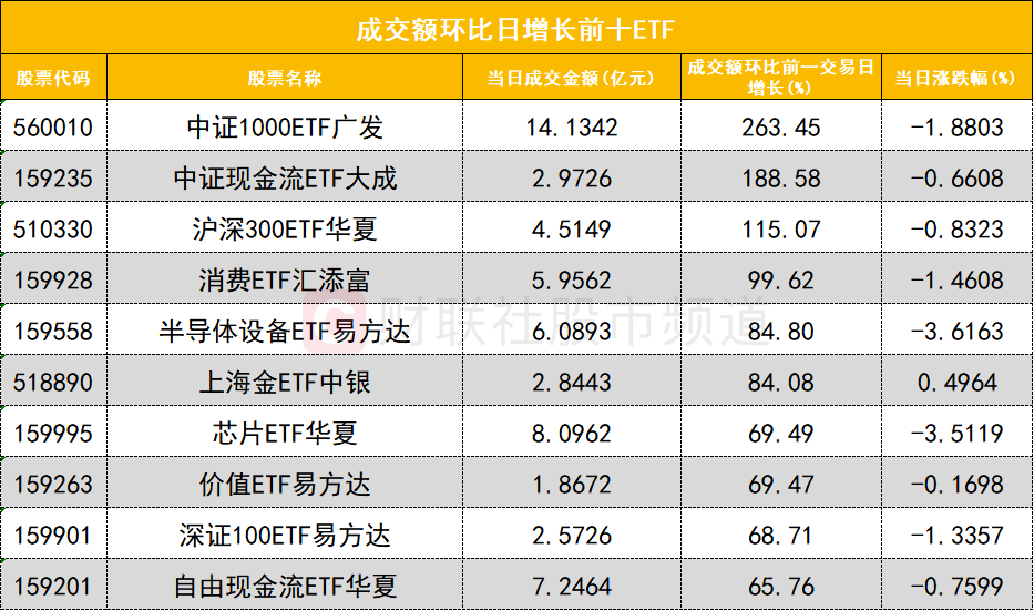 从成交额环比增长前十的ETF来看,中证1000ETF广发(560010)成交额环比增长263%位居首位;中证现金流ETF大成(159235)成交额环比增长188%位居次席。