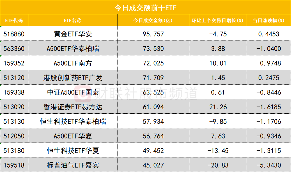 从成交额前十的ETF来看,黄金ETF华安(518880)成交额位居首位,A500ETF华泰柏瑞(563360)成交额位居次席。