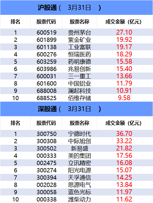从沪股通前十大成交个股来看,贵州茅台位居首位;紫金矿业和工业富联分居二、三位。