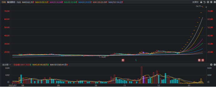 受重组概念催动,锋龙股份自去年(2025年)年末起开启连板之旅,截至今日收盘,其已连获15个涨停板,其中,复牌后仍录得2次涨停,整段行情期间合计涨幅达318%,总市值也从不足50亿元升至目前的163亿元。从量能数据上看,锋龙股份在此次连板行情中累计成交8.01亿元,其中,1月19日单日成交额达2.18亿元,占整段行情近27.2%比例。