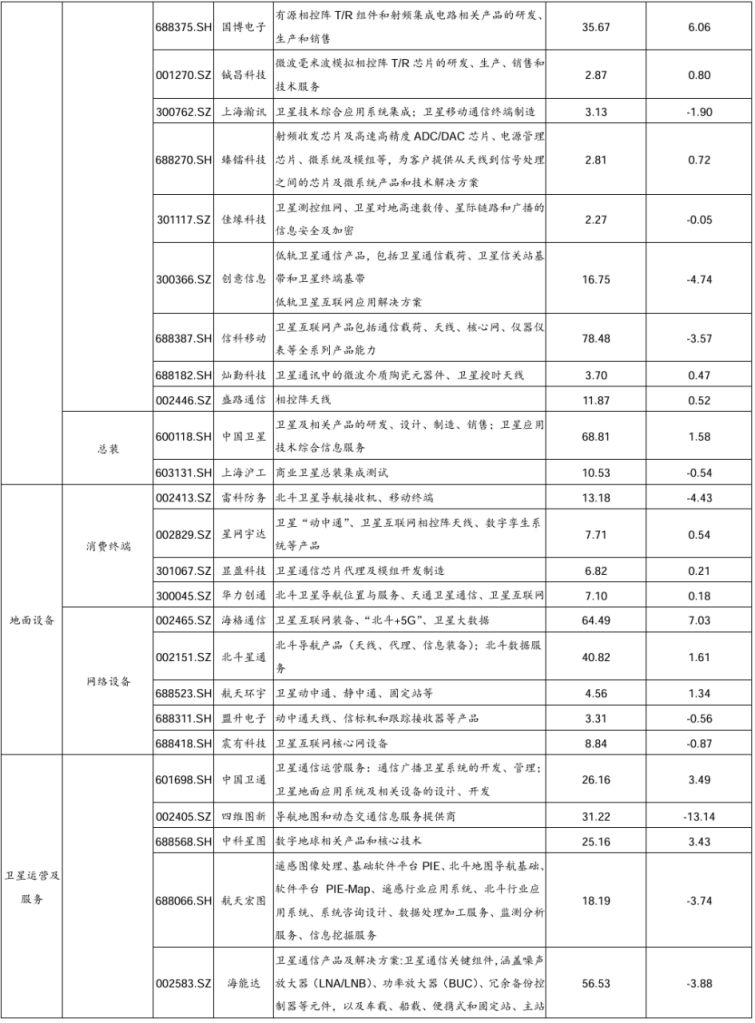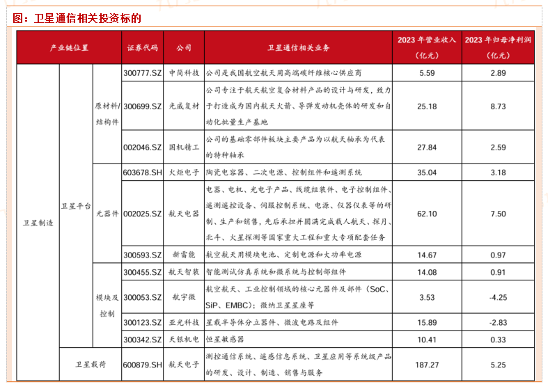2023年左右星网计划开始起步发射实验星,预计2024年下半年开始批量发射(利好卫星制造、火箭发射),预计2026年左右发射加速,商业模式开始成熟(利好卫星运营、卫星终端)。