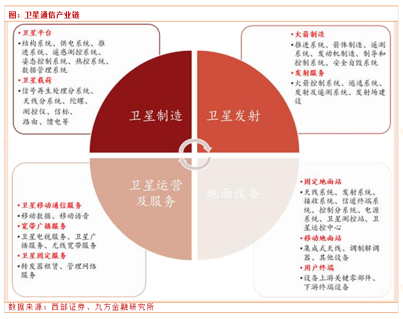 卫星通信可分为上游为卫星制造和卫星发射,中游为地面设备制造、卫星运营与服务,下游为卫星通信应用。