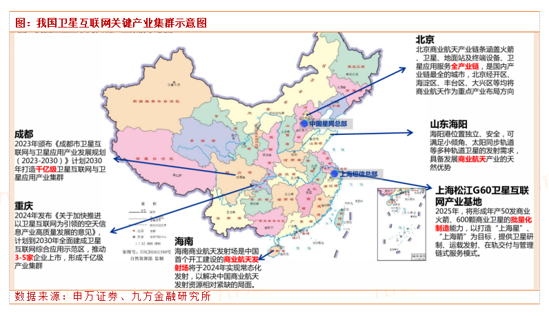 卫星互联网产业集群在全国多点开花,在政策由上至下引领下,各地发挥地理位置/技术积累等优势,形成散点式产业集群。1)北京、上海:综合产业集群;2)川渝:卫星产业链核心配套和应用;3)海南、山东:商业航天发射。