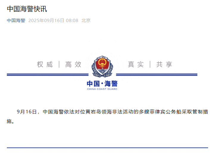 9月16日讯,据中国海警消息,9月16日,中国海警依法对位黄岩岛领海非法活动的多艘菲律宾公务船采取管制措施。