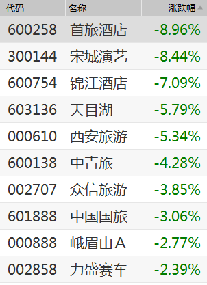 截至午间收盘,旅游酒店板块方面,首旅酒店大跌8.96%,宋城演艺大跌8.44%,锦江酒店大跌7.09%。