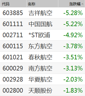 民航机场板块方面,吉祥航空、中国国航均大跌逾5%,东方航空、春秋航空、南方航空等跌逾3%。