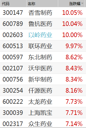 与此同时,抗病毒概念全线大涨,医药制造板块表现突出,香雪制药、鲁抗医药、以岭药业等多股涨停。