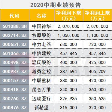 业绩预告中实现2020年上半年归属于上市公司股东净利润最高的中国神华在煤炭、电力、铁路运输三板块主要业务方面经营数据均环比修复。牧原股份紧随其后,实现归母净利润107.84亿元,同比增长7026.08%,同为生猪养殖龙头标的的温氏股份、新希望业绩表现也相当亮眼。