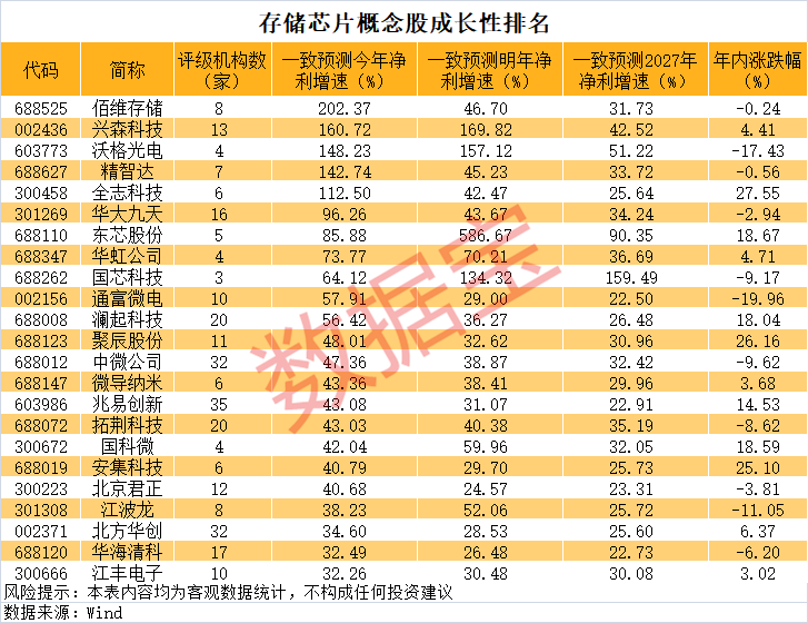 据统计,A股存储芯片概念股中,根据机构一致预测,有23股今年、明年及2027年净利增速均超20%,2024年研发支出逾亿元同时占营收比例超5%。这些高成长高科技的存储芯片概念股中,佰维存储、兴森科技、沃格光电、精智达、全志科技等个股机构一致预测今年净利翻倍增长。