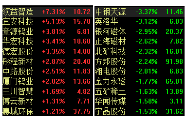 盘面上,稀土永磁板块今日涨跌不一,领益智造大涨7%,宜安科技涨超5%,章源钨业、华宏科技等涨超3%;而前期热门股普跌,英洛华、银河磁体、金力永磁、五矿稀土等均有一定程度的跌幅。