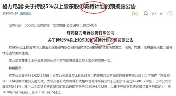 以格力电器6月19日的收盘价58.84元,京海担保此次减持的最高市值为25.23亿元。值得注意的是,这是京海担保近5年来首次启动减持计划。京海担保最近一次减持是2015年上半年,当时减持1909.61万股, 不过2015年下半年股市异常波动,京海担保又进行增持,此后一直保持持股5.36亿股未变,为格力电器的第二大股东。