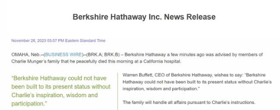 根据伯克希尔哈撒韦公司的新闻稿,查理·芒格于周二去世。该集团表示,芒格的家人告知其,芒格于周二上午在加州一家医院平静去世。