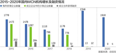 随着直播带货的火爆,MCN机构也在2019年和2020年迎来大爆发。MCN从事网红孵化和直播运营等活动,帮助网红打造人设形象和提供资源扶持,比如涨粉和内容运营等。根据启信宝的统计,2019年MCN机构增加达到2346家,是上年的两倍多,截至2020年6月,MCN机构新增达到1918家,增长势头猛烈。