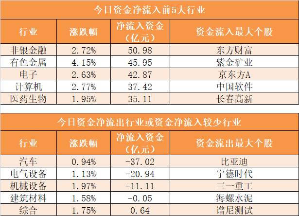 28个申万一级行业中,24个行业实现资金净流入,其中非银金融行业净流入50.98亿元居首。