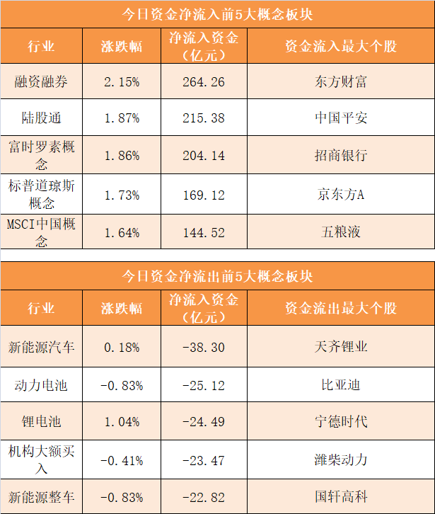 概念板块方面,今日融资融券、陆股通、富时罗素概念、标普道琼斯等概念板块资金呈现净流入,其中融资融券概念净流入264.26亿元居首。