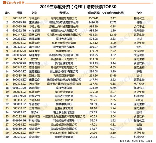 一直以来,QFII重仓的都是医药生物、信息技术等高新技术领域,三季度,东方财富Choice数据显示QFII共增持40家公司,其中钢铁和基础化工领域的增持股数居前。