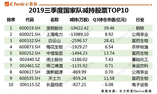 三季度国家队减持14只股票,其中对宝钢股份的减持最为凶猛,三季度减持1.94亿股,上海电力也被减持1.4亿股。减持超千亿的股票还有白云山梅花生物中恒集团闰土股份珠江啤酒
