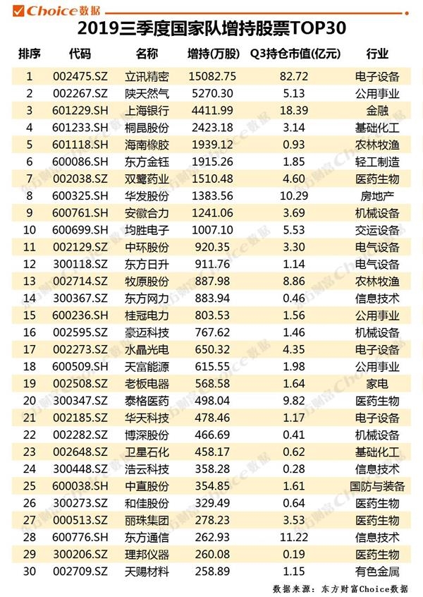 加仓排名第二的是陕天然气,三季度汇金加仓5270.30万股。上海银行被证金增持4411.99万股,其三季报显示其营业收入同比增长19.76%。