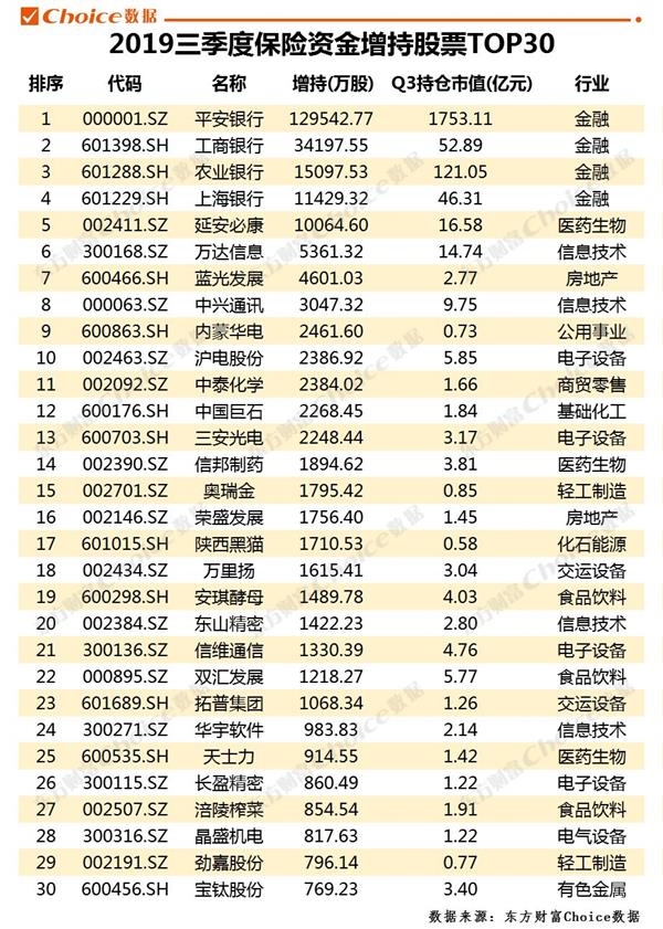 增持排名第一的是平安银行,三季度中国平安保险公司、中国平安人寿保险公司和旗下一只保险产品累计对平安银行增持1.3亿股。险资累计持仓市值高达1753.11亿元。