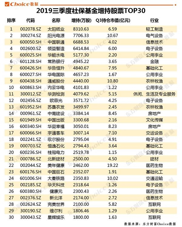 三季度,全国社保基金一零八组合和全国社保基金一一八组合均增持了太阳纸业,累计增持8310.63万股排名第一;阳光电源被全国社保基金一一八、全国社保基金一零八和广发基金管理有限公司-社保基金四二零累计增持7706.33万股;中国联通被全国社保基金一一二组合增持6688.53万股。