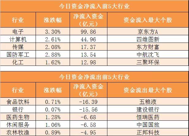 28个申万一级行业中,19个行业实现资金净流入,其中电子行业净流入99.86亿元居首。