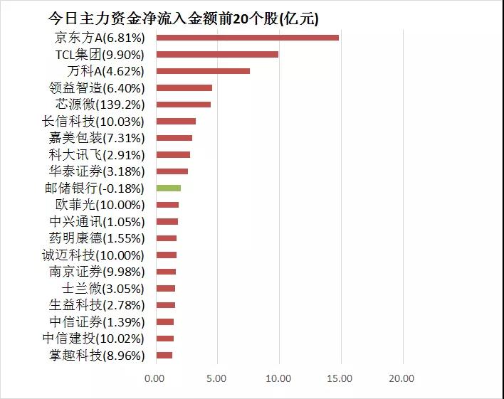 5、京东方A主力资金净流入14.77亿元居首