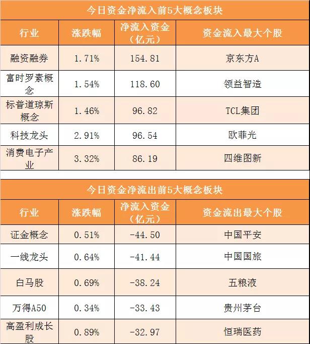 概念板块方面,今日融资融券、富时罗素概念、标普道琼斯概念、科技龙头等概念板块资金呈现净流入,其中融资融券概念净流入154.81亿元居首。