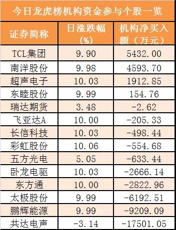 盘后龙虎榜数据显示,机构现身14股,其中TCL集团等4股呈现机构资金净买入,共达电声等10股呈现机构资金净卖出。