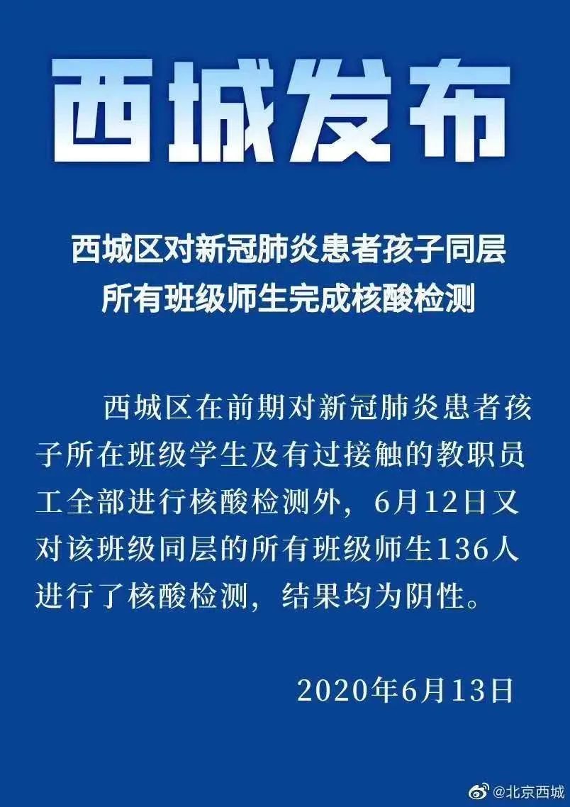 西城确诊病例涉及5处地点环境检测结果均为阴性据@西城健康 昨夜消息,6月12日,根据北京市疾控中心通报,确诊病例活动小区或场所涉及西城区的5处具体地点为:槐柏树街北里5号楼底商便民菜店、中国联通(长椿街营业厅)、首航超市(真武庙店)、中通快递(西客站分部)、西便门西里11号楼北一栋芳邻便民菜站。现已完成该5处地点的环境采样,核酸检测结果均为阴性。