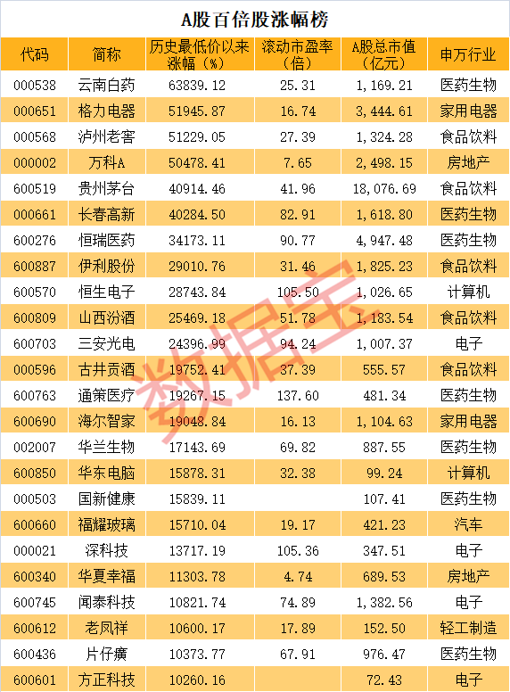 格力电器、泸州老窖、万科A等个股,最新价较历史最低价涨幅均超过500倍,分列A股百倍股涨幅榜第二至第四位,贵州茅台涨409倍位居第五位,长春高新涨近403倍位居第六,恒瑞医药、伊利股份、恒生电子、山西汾酒等个股均涨超200倍分列第七至第十位。