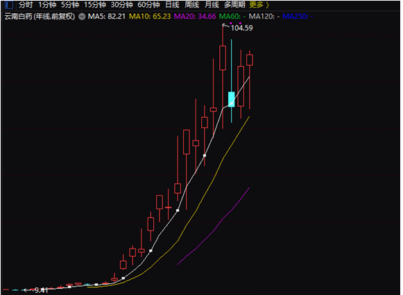 证券时报·数据宝统计显示,按照上市后最低价开始计算,A股历史上有24只个股自最低价以来涨幅超过百倍。其中,云南白药暴涨638倍居首。1993年上市的云南白药,于1994年7月见历史最低价2.35元,该股最新价91.53元,复权后较历史最低价涨幅超过638倍。