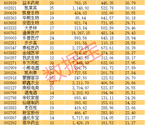 根据上述维度筛选后,合计共有46只个股。从行业来看,医药生物贡献了28只个股,食品饮料和建筑材料各贡献5只,轻工制造、商业贸易均贡献3只个股,家用电器贡献两只股票。