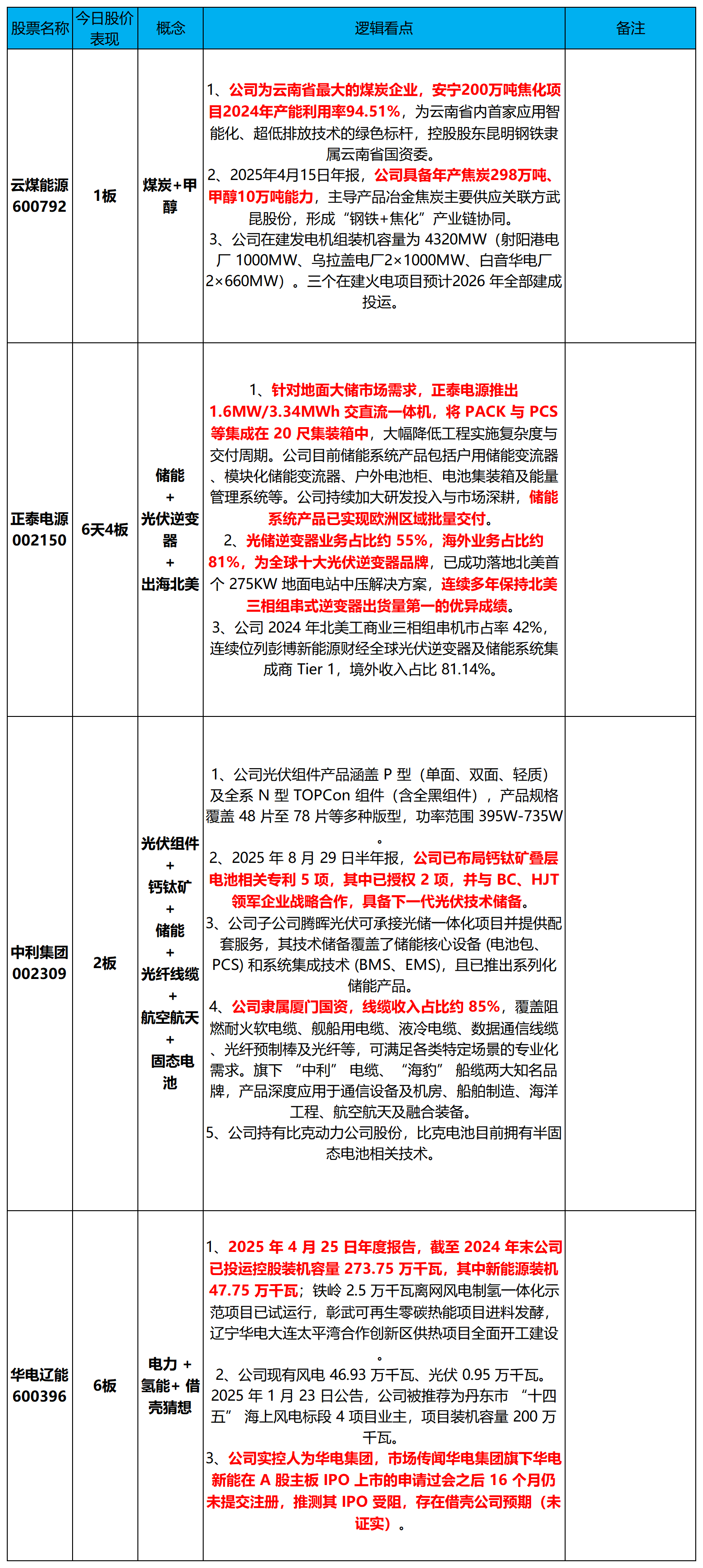 华电辽能600396、正泰电源002150、中利集团002309、