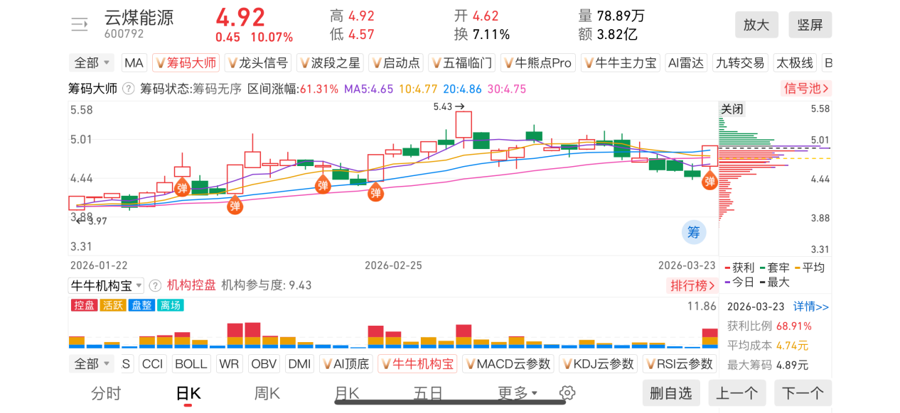 1)20260323-云煤能源-600792-【筹码大师】和【牛牛机构宝】-近期出现弹信号且底部量柱由绿转红