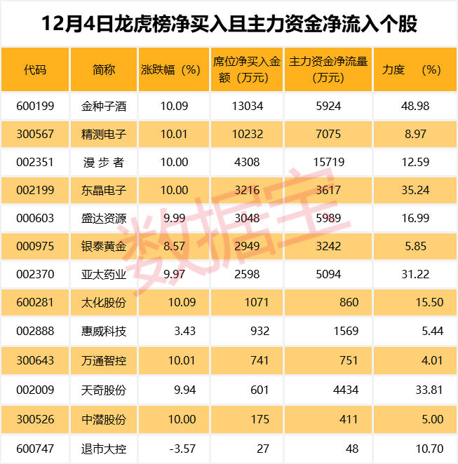 12月4日龙虎榜中机构及营业部席位资金净买入0.37亿元,其中净买入的个股有15只;净卖出的个股有7只。净买入前三名个股分别是金种子酒、精测电子、漫步者等,净买入金额占当日成交额比例达107.76%、12.97%、3.45%。
