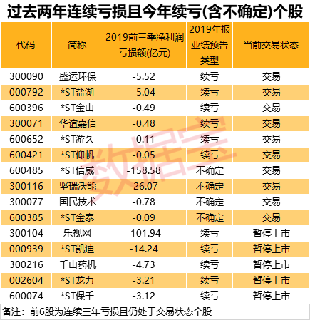 从年报预告来看,11股今年将继续续亏,也就是这11股将连续三年亏损。其中5股为暂停上市状态,包括乐视网、*ST凯迪、*ST保千等。