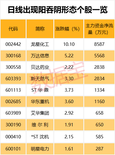 目前两市共有21只个股日K线出现阳吞阴形态,当天涨幅最大的是龙星化工、万达信息、捷昌驱动,涨幅分别为10.10%、5.22%、4.06%。