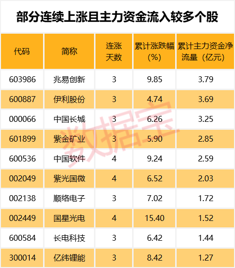 值得注意的是,485只连续上涨个股中,12只个股期间主力资金累计净流入超过亿元。其中,累计资金流入最多的为兆易创新,主力资金累计流入3.79亿元。