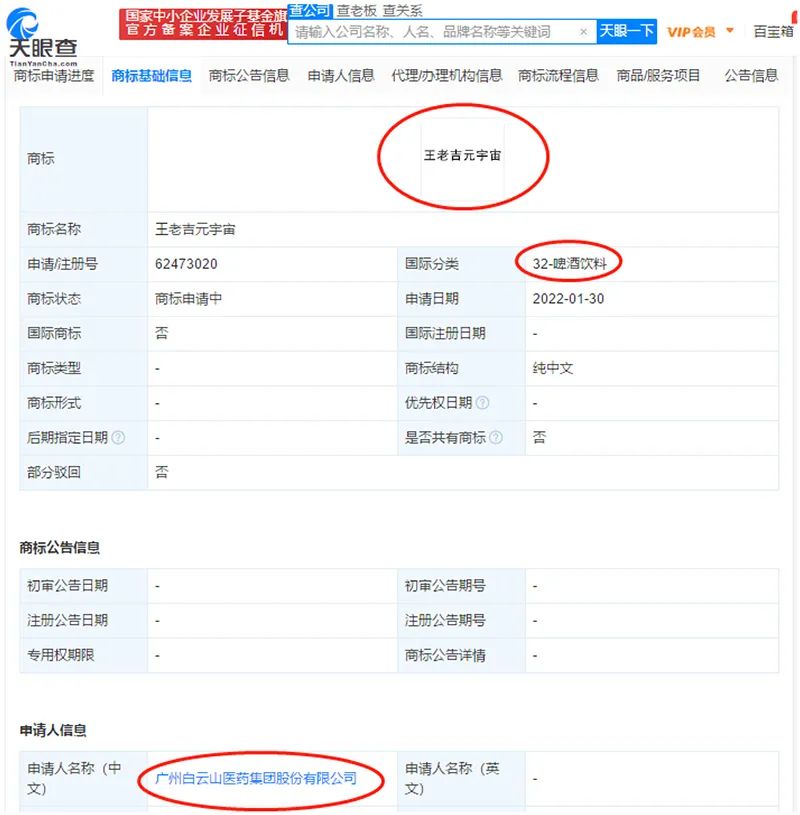 据天眼查显示,王老吉关联公司广州白云山医药集团股份有限公司近日确实在申请注册“王老吉元宇宙”商标,国际分类为“32类 啤酒饮料”,当前商标状态为“注册申请中”。
