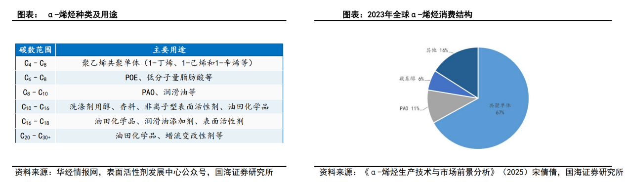 α-烯烃下游消费结构中,以用作聚烯烃共聚单体为主,2023年消费量约占全球总消费量67%,所需α-烯烃主要为1-丁烯、1-己烯和1-辛烯;第二大用途为生产合成润滑油基础油聚α-烯烃(PAO),2023年约占全球总消费量11%,消耗的α-烯烃以1-癸烯为主,此外还有1-辛烯、1-十二碳烯、1-十四碳烯;第三大消费领域为生产洗涤剂醇与增塑剂醇的羰基醇,2023年约占全球总消费量的6%。