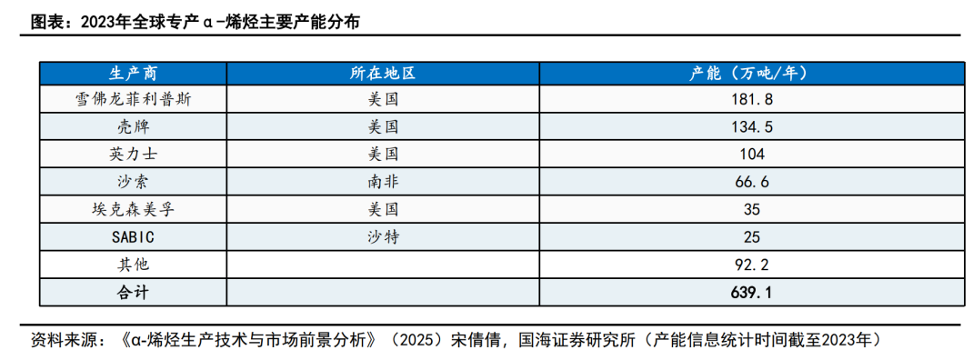全球α-烯烃市场集中度较高,依托乙烯齐聚技术垄断C6+高碳烯烃,前四大厂商(壳牌、雪佛龙菲利普斯化学、英力士、沙索)占据60%市场份额。截至2025年7月全球1-辛烯的产能97万吨/年,超80%的产能集中在这四家企业。