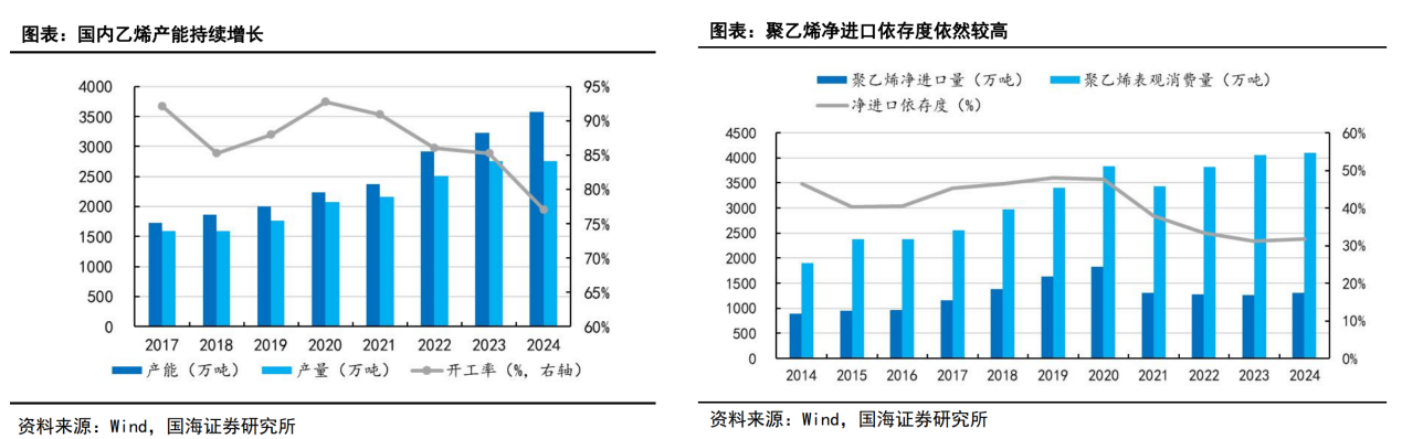 近年来,国内乙烯产能呈现快速增长态势。据公司公告,2024年,中国乙烯产能已达到5,489万吨,占全球总产能的24.95%,预计未来将进一步增长。然而行业“低端过剩,高端紧缺”的结构性问题愈发突出,高端聚烯烃自给率仅为65%。