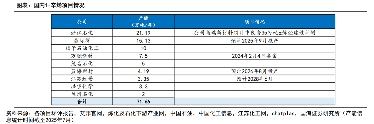 截至2025年7月,我国1-辛烯新建产能计划超70万吨。其中,浙江石化、辽宁鼎际得两大龙头合计超35万吨,占比超50%,将成为新增产能的核心支撑。