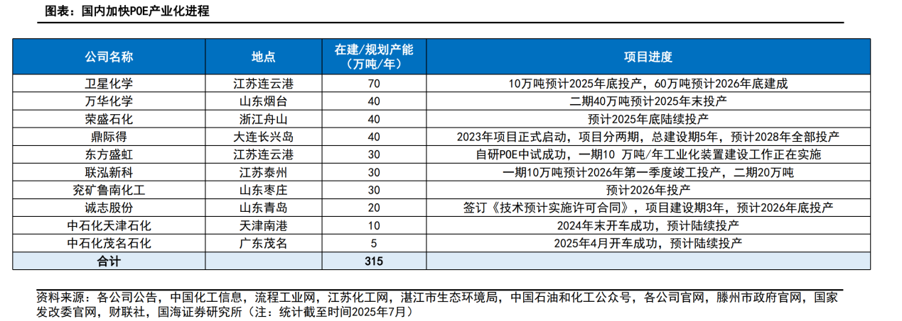 近年国内也加快POE产业化进程。据公司公告,卫星化学1000吨/年α-烯烃中试线已建成,10万吨/年α烯烃及配套POE预计2025年底投产,α-烯烃产业园项目60万吨POE预计2026年底建成;据中国化工信息及流程工业网,万华化学一期20万吨POE项目2024年顺利投产,二期40万吨POE预计2025年末投产;据公司公告,东方盛虹800吨/年中试项目已于2022年9月建成,一期10万吨/年POE工业化装置建设工作正在实施;据公司公告,荣盛石化高端新材料项目,其中包括40万吨/年POE,预计2025年底陆续投产。